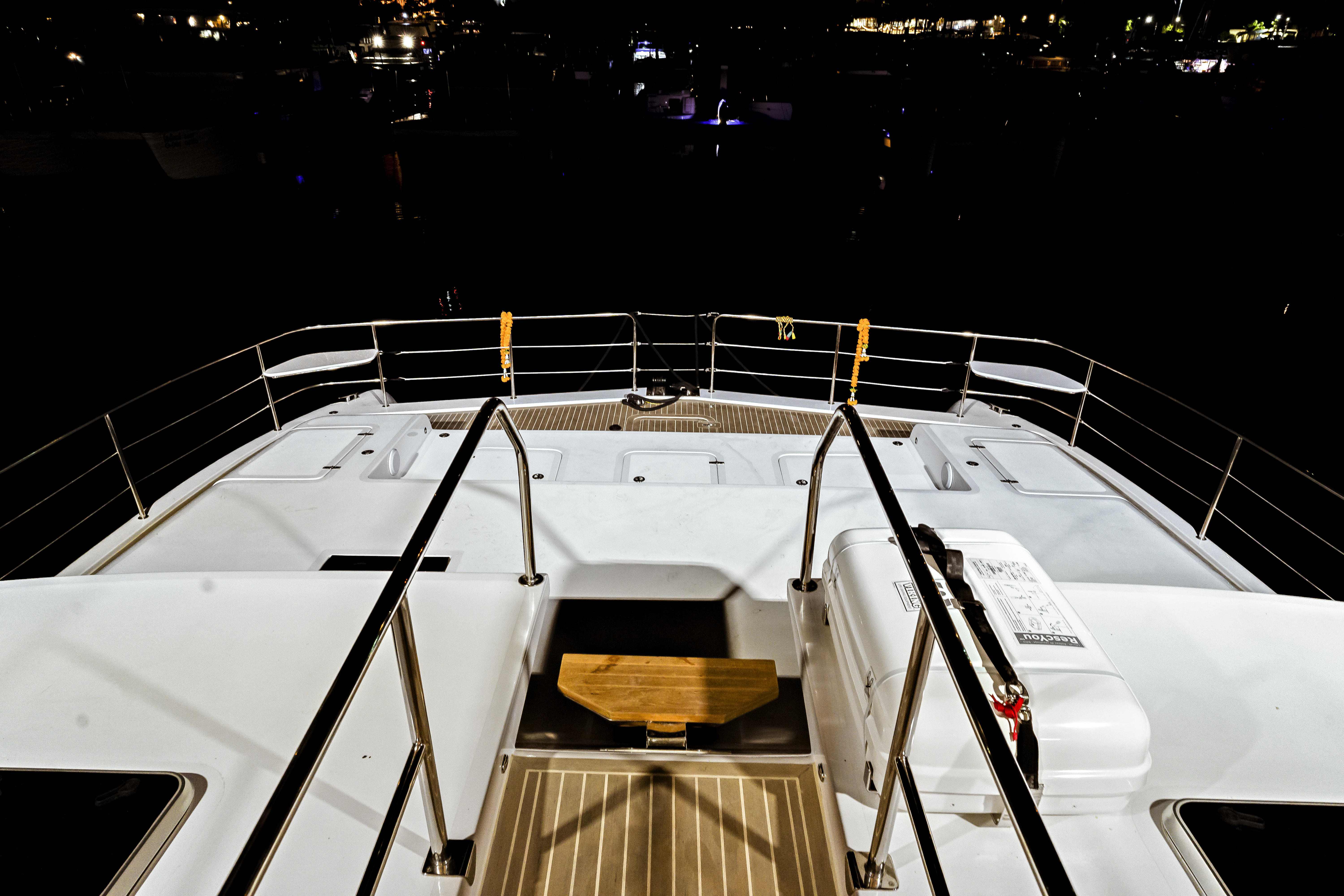 While the helm has twin seats with full support, a full suite of electronics at your fingertips and the wheel and throttle controls from the centre allowing you to stand when berthing. Either side of the helm seats are more lounging seats – people will just gravitate to these areas, plus forward steps to the front deck for easy access to the bow.